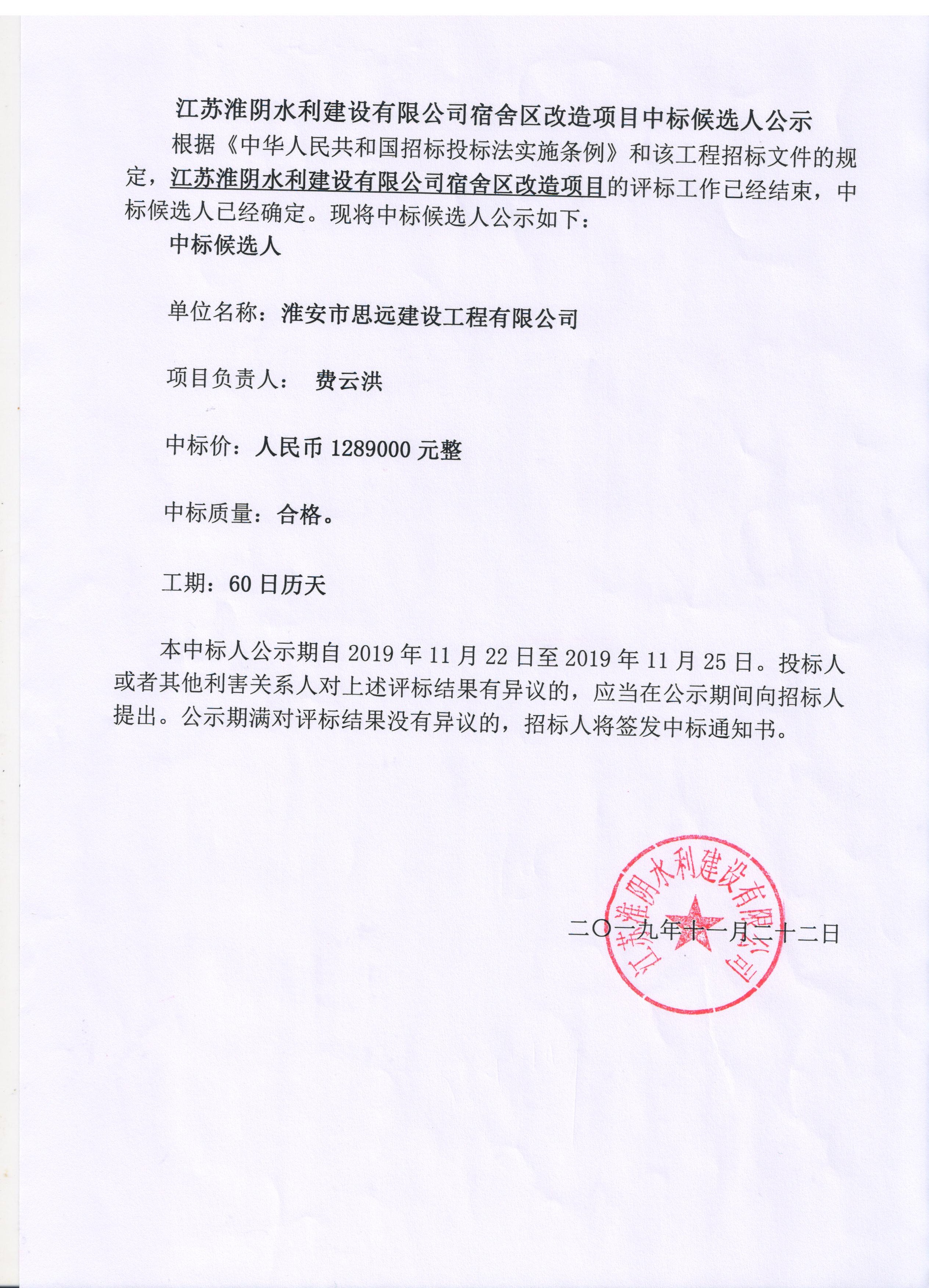 江蘇淮陰水利建設有限公司宿舍區(qū)改造項目中標候選人公示